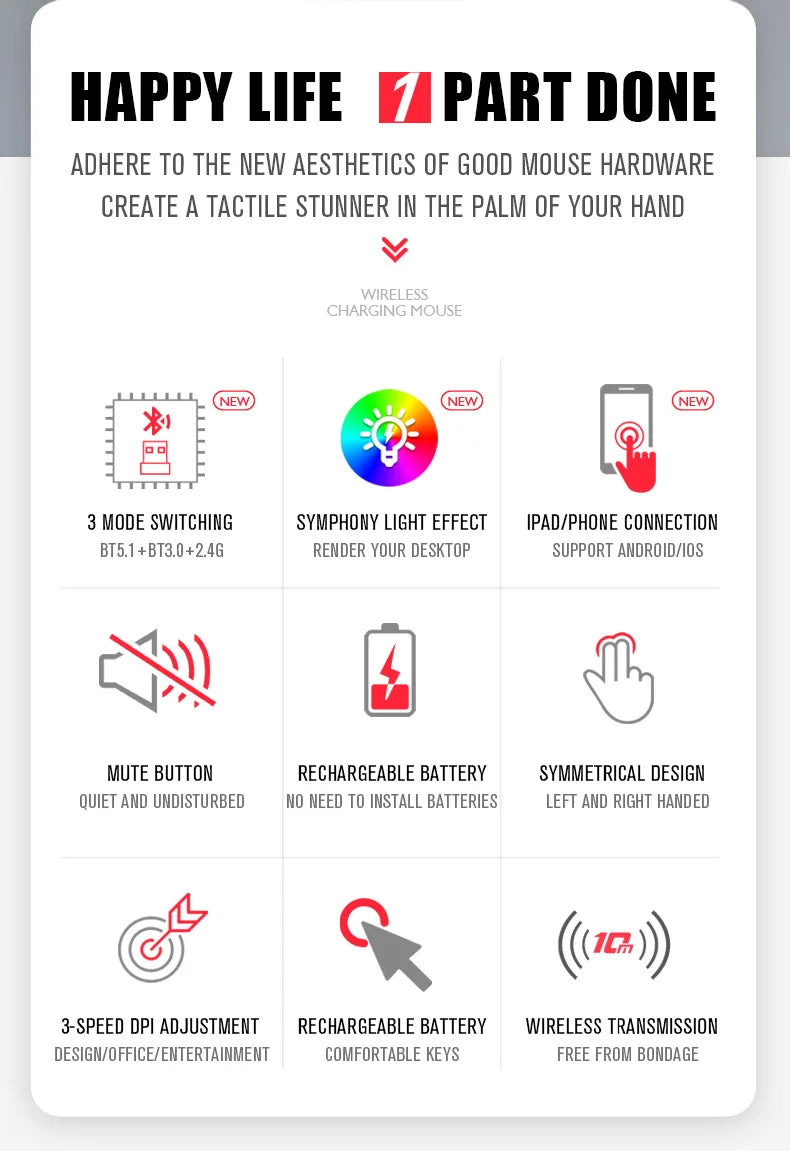 Step up your game and productivity with the HXSJ Rechargeable Dual-Mode Wireless RGB Mouse. Built for gamers and multi-taskers alike, this sleek mouse offers seamless switching between Bluetooth 5.2 and 2.4GHz USB connectivity, with a high-precision 1600 DPI sensor for fluid movement in both work and play. Its ultra-slim, ergonomic design, customizable RGB backlighting, and responsive scroll wheel deliver style and speed, while the rechargeable battery ensures long-lasting use without constant battery changes. Compatible with Windows, macOS, iOS (13+), and Android, it's your go-to mouse for laptops, tablets, and PCs.